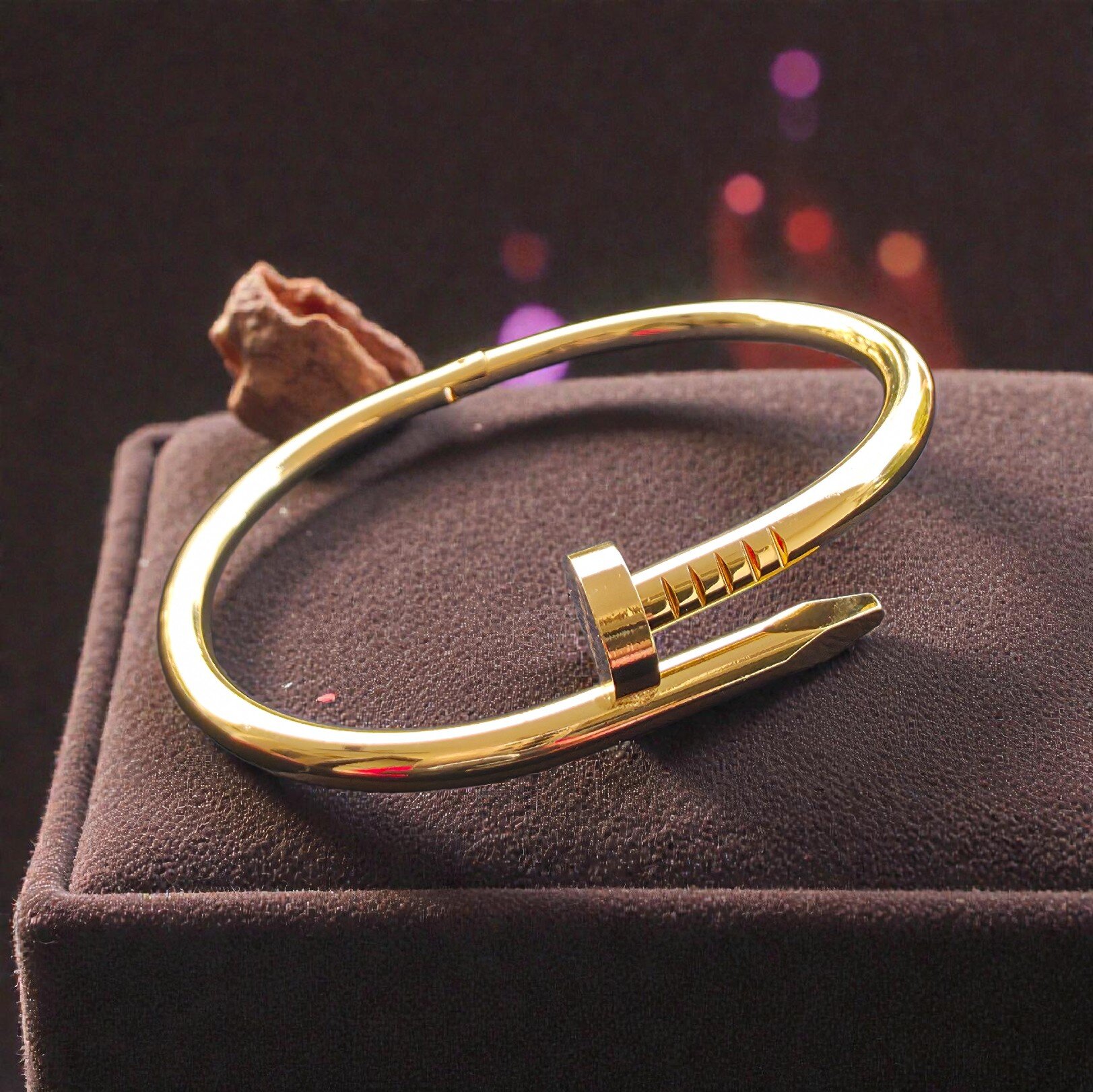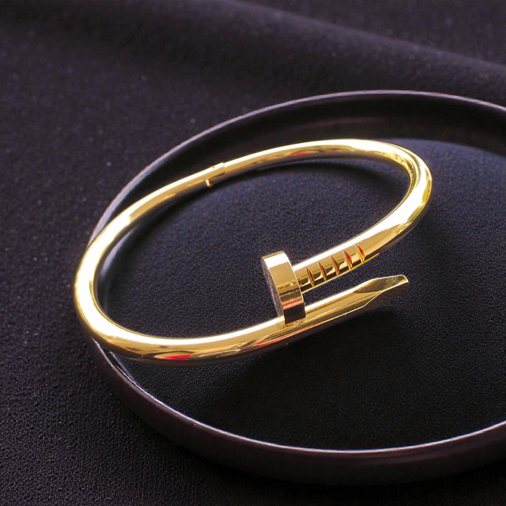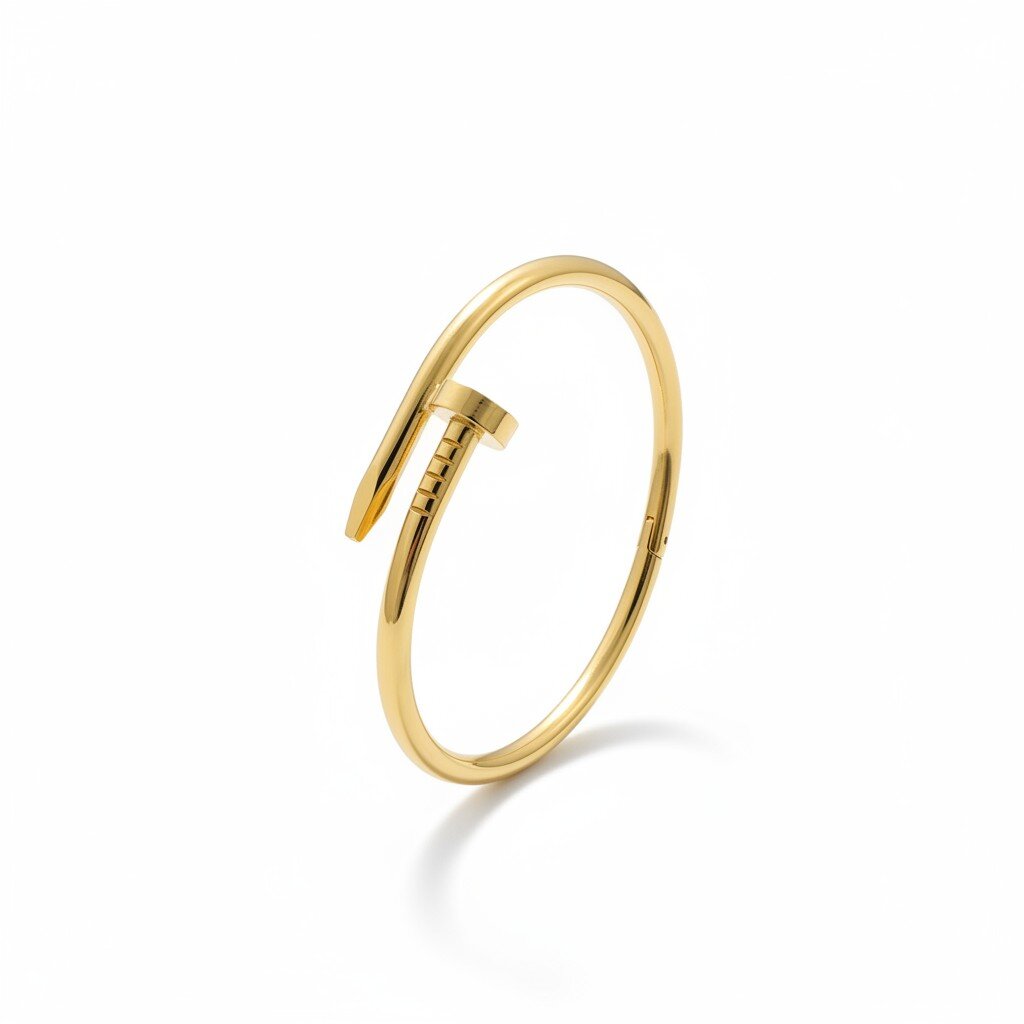 Elevate your wrist game with this stunning gold nail bracelet, featuring a bold curved nail motif inspired by luxury icons like Cartier’s Juste un Clou. Crafted from high-quality gold-plated metal, it offers a sleek, minimalist design perfect for everyday wear or stacking with other bangles. Hypoallergenic, tarnish-resistant, and adjustable for a comfortable fit, this trendy piece symbolizes strength and modern elegance—ideal for fashion-forward women.