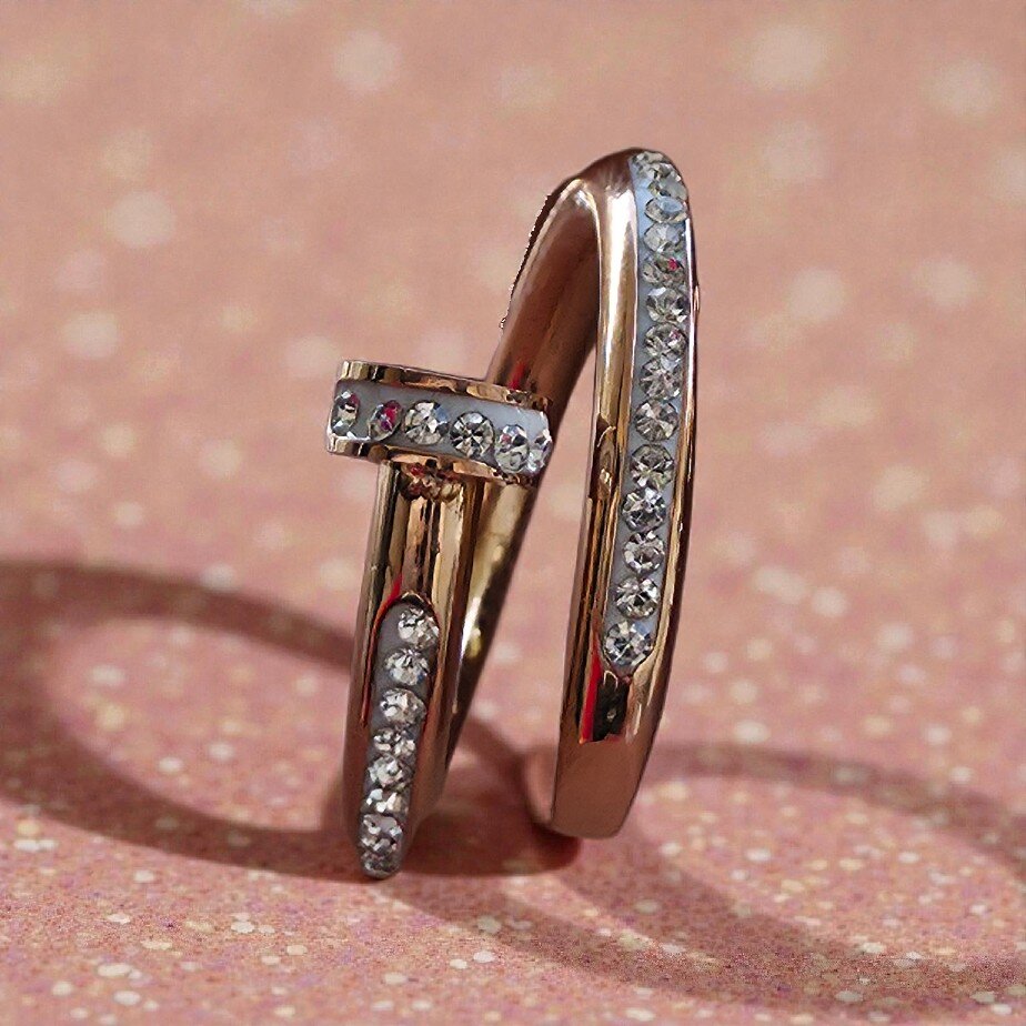 Hammer bold horizons with the Kizara Sculpted Nail Gold Rings Set—a visionary vignettes of two asymmetrical chevron silhouettes, one thrusting like a gilded nail with crystal-studded edge, the other encircling eternity in pavé poetry, both born from our titan anti-tarnish stainless steel in sovereign gold.